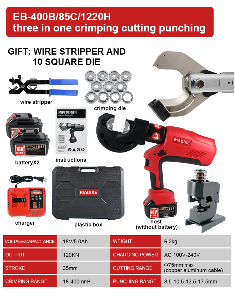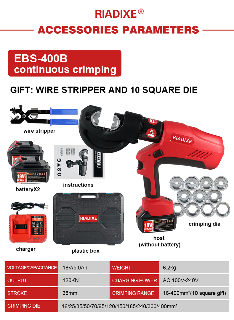 Бұл Emeads сымсыз гидравликалық сығу құралы тот баспайтын болаттан жасалған құбырды, қызыл мыс құбырды және алюминий пластик композициялық құбырды сығу үшін пайдалануға болады. 18V-4,0Ah батареямен (зарядтау уақыты 1,5 сағат). Emeads сымсыз гидравликалық қысқыш құралы бір жылдық кепілдікпен келеді.